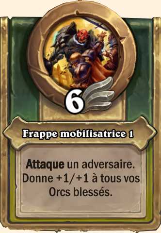 Frappe mobilisatrice Attaque un adversaire. Donne +2/+2 à tous vos Orcs blessés Attaque un adversaire. Donne +3/+3 à tous vos Orcs blessés Attaque un adversaire. Donne +3/+4 à tous vos Orcs blessés Attaque un adversaire. Donne +3/+5 à tous vos Orcs blessés |