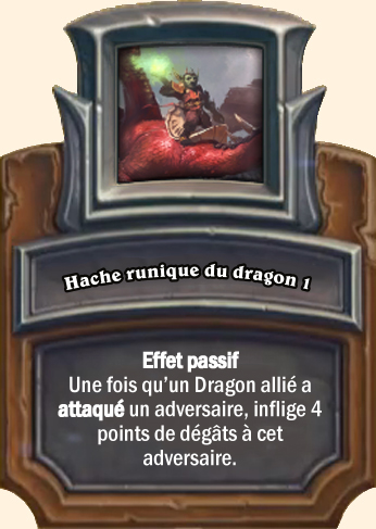 Hache runique du dragon Effet passif. Une fois qu’un Dragon allié a attaqué un adversaire, inflige 6 points de dégâts à cet adversaire Effet passif. Une fois qu’un Dragon allié a attaqué un adversaire, inflige 8 points de dégâts à cet adversaire Effet passif. Une fois qu’un Dragon allié a attaqué un adversaire, inflige 10 points de dégâts à cet adversaire |