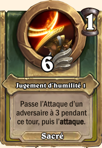 Jugement d’humilité Passe l’Attaque d’un adversaire à 2 pendant ce tour, puis l’attaque Passe l’Attaque d’un adversaire à 1 pendant ce tour, puis l’attaque Passe l’Attaque d’un adversaire à 1 pendant ce tour, puis l’attaque Passe l’Attaque d’un adversaire à 1 pendant ce tour, puis l’attaque |
