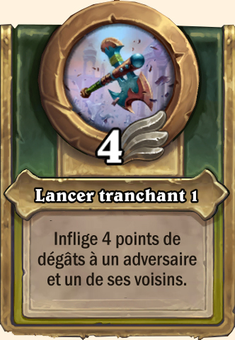 Lancer tranchant Inflige 5 points de dégâts à un adversaire et un de ses voisins Inflige 6 points de dégâts à un adversaire et un de ses voisins Inflige 7 points de dégâts à un adversaire et un de ses voisins Inflige 8 points de dégâts à un adversaire et un de ses voisins |