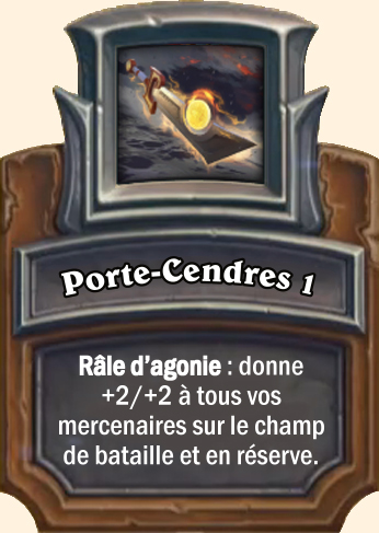 Porte-Cendres Râle d’agonie : donne +4/+4 à tous vos mercenaires sur le champ de bataille et en réserve Râle d’agonie : donne +6/+6 à tous vos mercenaires sur le champ de bataille et en réserve Râle d’agonie : donne +8/+8 à tous vos mercenaires sur le champ de bataille et en réserve |