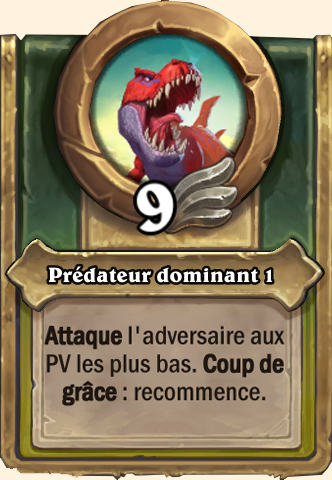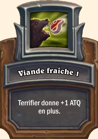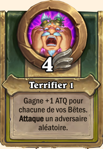 Terrifier Gagne +2 ATQ pour chacune de vos Bêtes. Attaque un adversaire aléatoire Gagne +3 ATQ pour chacune de vos Bêtes. Attaque un adversaire aléatoire Gagne +4 ATQ pour chacune de vos Bêtes. Attaque un adversaire aléatoire Gagne +5 ATQ pour chacune de vos Bêtes. Attaque un adversaire aléatoire |