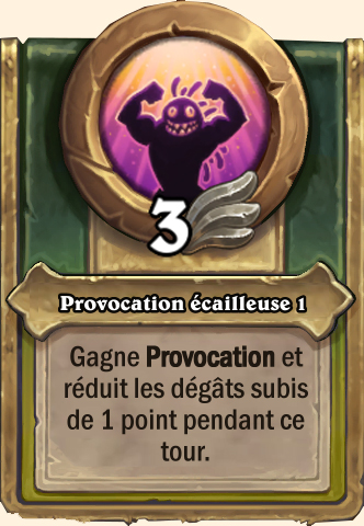 Provocation écailleuse Gagne Provocation et réduit les dégâts subis de 2 points pendant ce tour Gagne Provocation et réduit les dégâts subis de 3 points pendant ce tour Gagne Provocation et réduit les dégâts subis de 4 points pendant ce tour Gagne Provocation et réduit les dégâts subis de 5 points pendant ce tour |