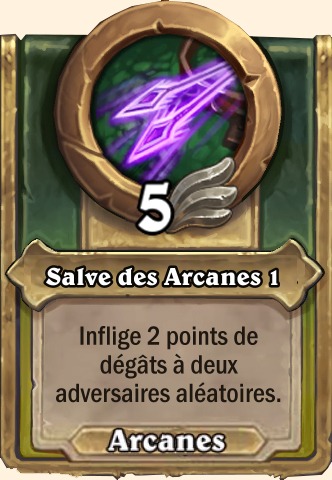 Salve des Arcanes Inflige 4 points de dégâts à deux adversaires aléatoires Inflige 6 points de dégâts à deux adversaires aléatoires Inflige 7 points de dégâts à deux adversaires aléatoires Inflige 8 points de dégâts à deux adversaires aléatoires |