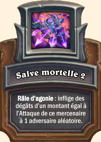 Salve mortelle Râle d’agonie : inflige des dégâts d’un montant égal à l’Attaque de ce mercenaire à 2 adversaires aléatoires Râle d’agonie : inflige des dégâts d’un montant égal à l’Attaque de ce mercenaire à tous les adversaires |