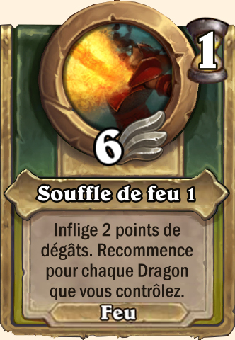 Souffle de feu Inflige 5 points de dégâts. Recommence pour chaque Dragon que vous contrôlez Inflige 8 points de dégâts. Recommence pour chaque Dragon que vous contrôlez Inflige 9 points de dégâts. Recommence pour chaque Dragon que vous contrôlez Inflige 10 points de dégâts. Recommence pour chaque Dragon que vous contrôlez |
