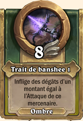 Trait de banshee Gagne +2 ATQ pour chaque personnage allié mort pendant cette partie Gagne +3 ATQ pour chaque personnage allié mort pendant cette partie Gagne +4 ATQ pour chaque personnage allié mort pendant cette partie Gagne +5 ATQ pour chaque personnage allié mort pendant cette partie |