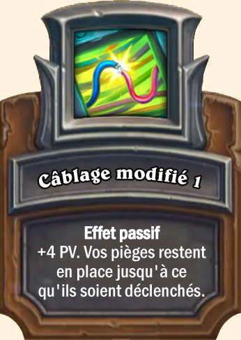 Câblage modifié Effet passif : +6 PV. Vos pièges restent en place jusqu'à ce qu'ils soient déclenchés Effet passif : +8 PV. Vos pièges restent en place jusqu'à ce qu'ils soient déclenchés Effet passif : +10 PV. Vos pièges restent en place jusqu'à ce qu'ils soient déclenchés |