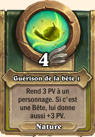 Guérison de la bête Rend 7 PV à un personnage. Si c'est une Bête, lui donne aussi +7 PV Rend 11 PV à un personnage. Si c'est une Bête, lui donne aussi +11 PV Rend 13 PV à un personnage. Si c'est une Bête, lui donne aussi +13 PV Rend 15 PV à un personnage. Si c'est une Bête, lui donne aussi +15 PV |