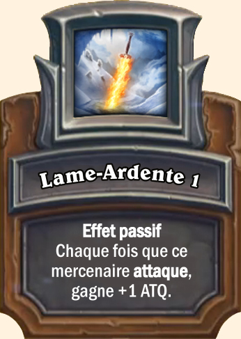 Lame-Ardente Effet passif. Chaque fois que ce mercenaire attaque, gagne +2 ATQ Effet passif. Chaque fois que ce mercenaire attaque, gagne +2/+1 Effet passif. Chaque fois que ce mercenaire attaque, gagne +2/+2 |