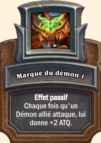 Marque du démon Effet passif. Chaque fois qu'un Démon allié attaque, lui donne +3 ATQ Effet passif. Chaque fois qu'un Démon allié attaque, lui donne +4 ATQ Effet passif. Chaque fois qu'un Démon allié attaque, lui donne +5 ATQ |