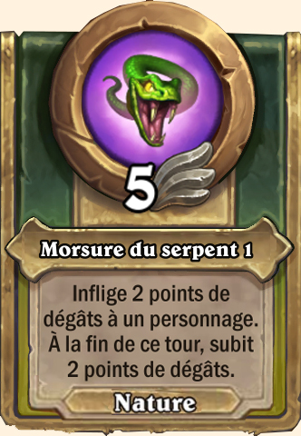 Morsure du serpent Inflige 3 points de dégâts à un personnage . À la fin de ce tour, subit 3 points de dégâts Inflige 4 points de dégâts à un personnage . À la fin de ce tour, subit 4 points de dégâts Inflige 5 points de dégâts à un personnage . À la fin de ce tour, subit 5 points de dégâts Inflige 6 points de dégâts à un personnage . À la fin de ce tour, subit 6 points de dégâts |