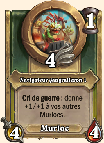 Navigateur gangraileron Cri de guerre : donne +2/+2 à vos autres Murlocs (6/6) Cri de guerre : donne +3/+3 à vos autres Murlocs (8/8) Cri de guerre : donne +4/+4 à vos autres Murlocs (9/9) Cri de guerre : donne +5/+5 à vos autres Murlocs (10/10) |