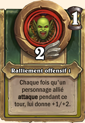 Ralliement offensif Chaque fois qu'un personnage allié attaque pendant ce tour, lui donne +2/+4 Chaque fois qu'un personnage allié attaque pendant ce tour, lui donne +4/+8 Chaque fois qu'un personnage allié attaque pendant ce tour, lui donne +4/+10 Chaque fois qu'un personnage allié attaque pendant ce tour, lui donne +2/+10 |