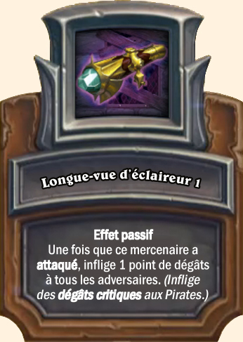 Longue-vue d’éclaireur Effet Passif. Une fois que ce mercenaire a attaqué, inflige 2 points de dégâts à tous les adversaires. [...] Effet Passif. Une fois que ce mercenaire a attaqué, inflige 3 points de dégâts à tous les adversaires. [...] Effet Passif. Une fois que ce mercenaire a attaqué, inflige 4 points de dégâts à tous les adversaires. [...] |