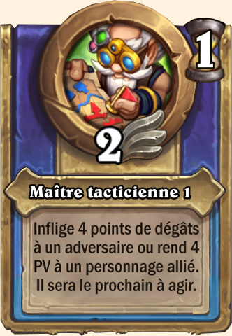 Maître tacticienne Inflige 7 points de dégâts à un adversaire ou rend 7 PV à un personnage allié. Il sera le prochain à agir Inflige 10 points de dégâts à un adversaire ou rend 10 PV à un personnage allié. Il sera le prochain à agir Inflige 11 points de dégâts à un adversaire ou rend 11 PV à un personnage allié. Il sera le prochain à agir Inflige 12 points de dégâts à un adversaire ou rend 12 PV à un personnage allié. Il sera le prochain à agir |