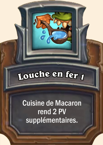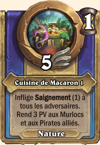 Cuisine de Macaron Inflige Saignement (2) à tous les adversaires. Rend 3 PV aux Murlocs et aux Pirates alliés Inflige Saignement (3) à tous les adversaires. Rend 4 PV aux Murlocs et aux Pirates alliés Inflige Saignement (4) à tous les adversaires. Rend 4 PV aux Murlocs et aux Pirates alliés Inflige Saignement (5) à tous les adversaires. Rend 5 PV aux Murlocs et aux Pirates alliés |