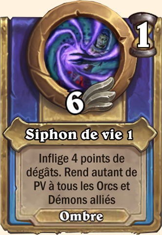 Siphon de vie Inflige 7 points de dégâts. Rend autant de PV à tous les Orcs et Démons alliés Inflige 10 points de dégâts. Rend autant de PV à tous les Orcs et Démons alliés Inflige 11 points de dégâts. Rend autant de PV à tous les Orcs et Démons alliés Inflige 12 points de dégâts. Rend autant de PV à tous les Orcs et Démons alliés |