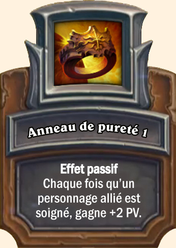 Anneau de pureté Effet passif. Chaque fois qu’un personnage allié est soigné, gagne +3 PV Effet passif. Chaque fois qu’un personnage allié est soigné, gagne +4 PV Effet passif. Chaque fois qu’un personnage allié est soigné, gagne +5 PV |