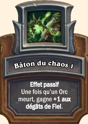 Bâton du chaos Effet passif. Une fois qu’un Orc meurt, gagne +2 aux dégâts de Fiel Effet passif. Une fois qu’un Orc meurt, gagne +3 aux dégâts de Fiel Effet passif. Une fois qu’un Orc meurt, gagne +4 aux dégâts de Fiel |