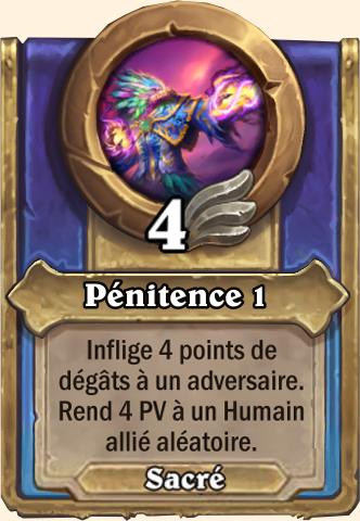 Pénitence Inflige 7 points de dégâts à un adversaire. Rend 8 PV à un Humain allié aléatoire Inflige 10 points de dégâts à un adversaire. Rend 12 PV à un Humain allié aléatoire Inflige 11 points de dégâts à un adversaire. Rend 13 PV à un Humain allié aléatoire Inflige 12 points de dégâts à un adversaire. Rend 14 PV à un Humain allié aléatoire |