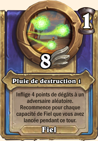 Pluie de destruction Inflige 8 points de dégâts a un ennemi aléatoire. [...] Inflige 12 points de dégâts a un ennemi aléatoire. [...] Inflige 13 points de dégâts a un ennemi aléatoire. [...] Inflige 14 points de dégâts a un ennemi aléatoire. [...] |