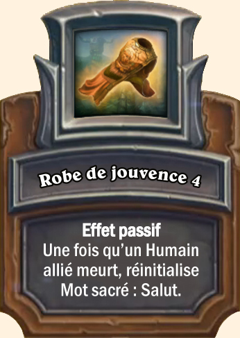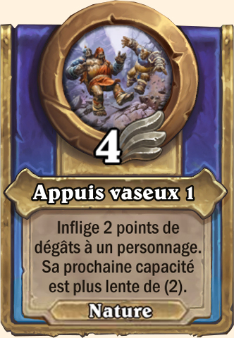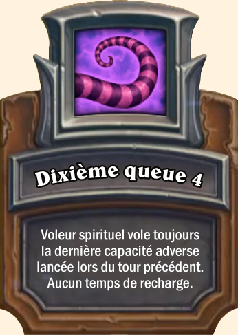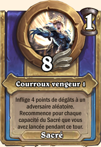 Courroux vengeur Inflige 8 points de dégâts à un adversaire aléatoire. [...] Inflige 12 points de dégâts à un adversaire aléatoire. [...] Inflige 13 points de dégâts à un adversaire aléatoire. [...] Inflige 14 points de dégâts à un adversaire aléatoire [...] |