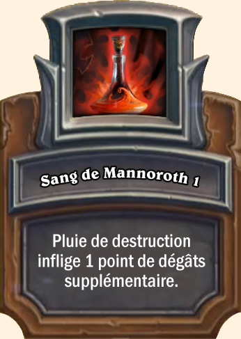 Sang de Mannoroth Pluie de destruction inflige 2 points de dégâts supplémentaires Pluie de destruction inflige 3 points de dégâts supplémentaires Pluie de destruction inflige 4 points de dégâts supplémentaires |