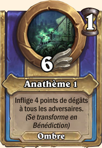 Anathème Inflige 7 points de dégâts à tous les adversaires. (Se transforme en Bénédiction) Inflige 11 points de dégâts à tous les adversaires. (Se transforme en Bénédiction) Inflige 13 points de dégâts à tous les adversaires. (Se transforme en Bénédiction) Inflige 14 points de dégâts à tous les adversaires. (Se transforme en Bénédiction) |