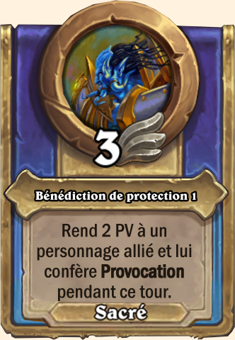 Bénédiction de protection Rend 4 PV à un personnage allié et lui confère Provocation pendant ce tour Rend 6 PV à un personnage allié et lui confère Provocation pendant ce tour Rend 8 PV à un personnage allié et lui confère Provocation pendant ce tour Rend 10 PV à un personnage allié et lui confère Provocation pendant ce tour |