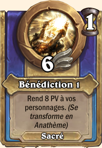 Bénédiction Rend 16 PV à vos personnages. (Se transforme en Anathème) Rend 24 PV à vos personnages. (Se transforme en Anathème) Rend 27 PV à vos personnages. (Se transforme en Anathème) Rend 30 PV à vos personnages. (Se transforme en Anathème) |
