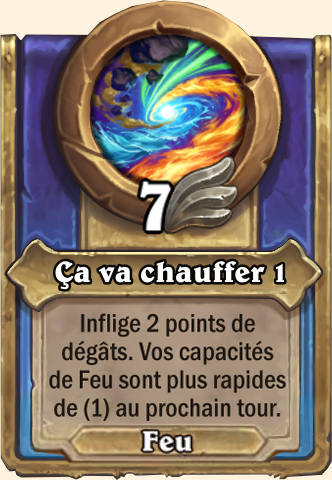 Ça va chauffer Inflige 6 points de dégâts. Vos capacités de Feu sont plus rapides de (1) au prochain tour Inflige 10 points de dégâts. Vos capacités de Feu sont plus rapides de (1) au prochain tour Inflige 11 points de dégâts. Vos capacités de Feu sont plus rapides de (1) au prochain tour Inflige 12 points de dégâts. Vos capacités de Feu sont plus rapides de (1) au prochain tour |
