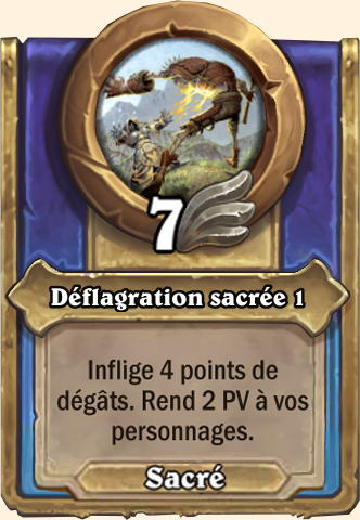 Déflagration sacrée Inflige 6 points de dégâts. Rend 3 PV à vos personnages Inflige 8 points de dégâts. Rend 4 PV à vos personnages Inflige 10 points de dégâts. Rend 5 PV à vos personnages Inflige 12 points de dégâts. Rend 6 PV à vos personnages |