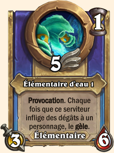 Élémentaire d'eau 1 Provocation. Chaque fois que ce serviteur inflige des dégâts à un personnage, le gèle (6/10) Provocation. Chaque fois que ce serviteur inflige des dégâts à un personnage, le gèle (10/14) Provocation. Chaque fois que ce serviteur inflige des dégâts à un personnage, le gèle (11/15) Provocation. Chaque fois que ce serviteur inflige des dégâts à un personnage, le gèle (12/16) |