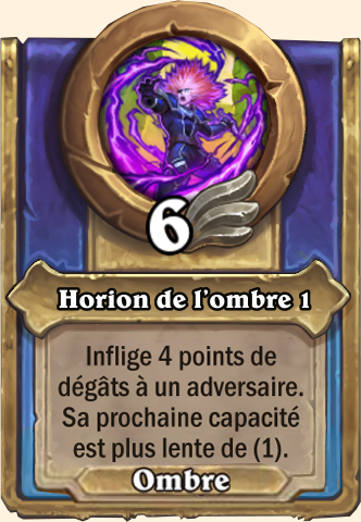Horion de l'ombre Inflige 7 points de dégâts à un adversaire. Sa prochaine capacité est plus lente de (2) Inflige 10 points de dégâts à un adversaire. Sa prochaine capacité est plus lente de (3) Inflige 11 points de dégâts à un adversaire. Sa prochaine capacité est plus lente de (4) Inflige 12 points de dégâts à un adversaire. Sa prochaine capacité est plus lente de (5) |