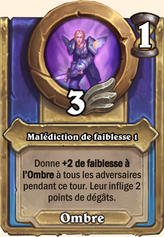 Malédiction de faiblesse Donne +3 de faiblesse à l'Ombre à tous les adversaires pendant ce tour. Leur inflige 4 points de dégâts Donne +4 de faiblesse à l'Ombre à tous les adversaires pendant ce tour. Leur inflige 6 points de dégâts Donne +5 de faiblesse à l'Ombre à tous les adversaires pendant ce tour. Leur inflige 7 points de dégâts Donne +6 de faiblesse à l'Ombre à tous les adversaires pendant ce tour. Leur inflige 8 points de dégâts |