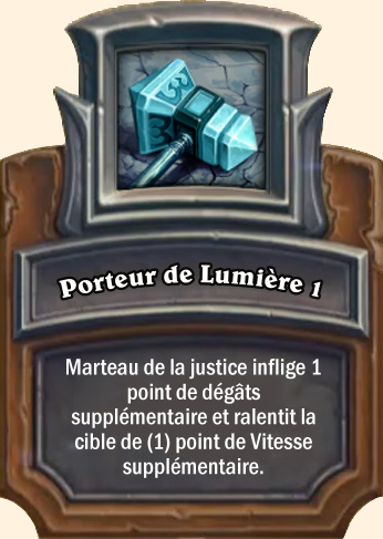 Porteur de Lumière Marteau de la justice inflige 2 points de dégâts supplémentaires et ralentit la cible de (1) point de Vitesse [...] Marteau de la justice inflige 3 points de dégâts supplémentaires et ralentit la cible de (2) points de Vitesse [...] Marteau de la justice inflige 4 points de dégâts supplémentaires et ralentit la cible de (2) points de Vitesse [...] |