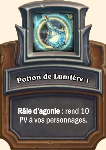 Potion de Lumière Râle d'agonie : rend 20 PV à vos personnages Râle d'agonie : rend 30 PV à vos personnages Râle d'agonie : rend 40 PV à vos personnages |
