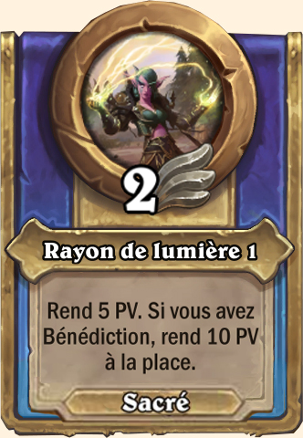 Rayon de lumière Rend 7 PV. Si vous avez Bénédiction, rend 14 PV à la place Rend 9 PV. Si vous avez Bénédiction, rend 18 PV à la place Rend 9 PV. Si vous avez Bénédiction, rend 20 PV à la place Rend 10 PV. Si vous avez Bénédiction, rend 20 PV à la place |