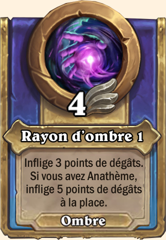 Rayon d'ombre Inflige 5 points de dégâts. Si vous avez Anathème, inflige 9 points de dégâts à la place Inflige 8 points de dégâts. Si vous avez Anathème, inflige 14 points de dégâts à la place Inflige 15 points de dégâts. Si vous avez Anathème, inflige 9 points de dégâts à la place Inflige 10 points de dégâts. Si vous avez Anathème, inflige 16 points de dégâts à la place |