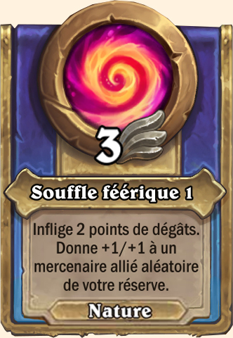 Souffle féérique Inflige 5 points de dégâts. Donne +2/+2 à un mercenaire allié aléatoire de votre réserve Inflige 8 points de dégâts. Donne +3/+3 à un mercenaire allié aléatoire de votre réserve Inflige 9 points de dégâts. Donne +3/+4 à un mercenaire allié aléatoire de votre réserve Inflige 10 points de dégâts. Donne +3/+5 à un mercenaire allié aléatoire de votre réserve |