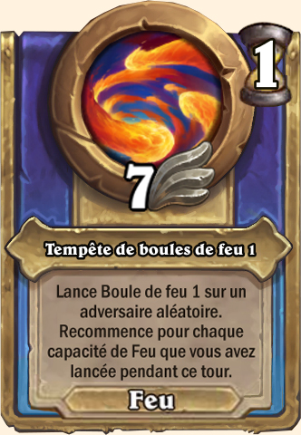 Tempête de boules de feu Lance Boule de feu 2 sur un adversaire aléatoire. [...] Lance Boule de feu 3 sur un adversaire aléatoire. [...] Lance Boule de feu 4 sur un adversaire aléatoire. [...] Lance Boule de feu 5 sur un adversaire aléatoire. [...] |