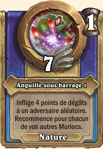 Anguille sous barrage Inflige 7 dégâts à un adversaire aléatoire. Recommence pour chacun de vos autres Murlocs Inflige 10 dégâts à un adversaire aléatoire. Recommence pour chacun de vos autres Murlocs Inflige 11 dégâts à un adversaire aléatoire. Recommence pour chacun de vos autres Murlocs Inflige 12 dégâts à un adversaire aléatoire. Recommence pour chacun de vos autres Murlocs |