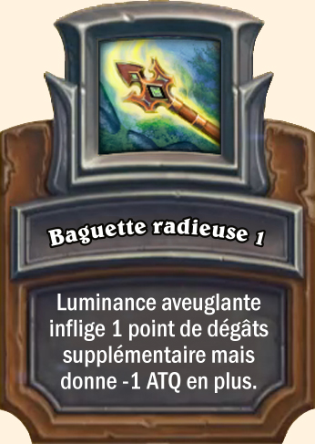 Baguette radieuse Luminance aveuglante inflige 2 points de dégâts supplémentaires mais donne -2 ATQ en plus Luminance aveuglante inflige 3 points de dégâts supplémentaires mais donne -3 ATQ en plus Luminance aveuglante inflige 4 points de dégâts supplémentaires mais donne -4 ATQ en plus |