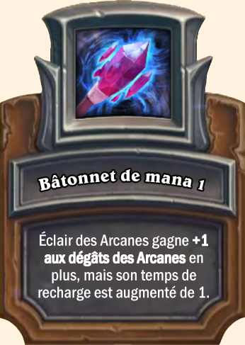 Bâtonnet de mana Éclair des Arcanes gagne +2 aux dégâts des Arcanes en plus, mais son temps de recharge est augmenté de 1 Éclair des Arcanes gagne +3 aux dégâts des Arcanes en plus, mais son temps de recharge est augmenté de 1 Éclair des Arcanes gagne +4 aux dégâts des Arcanes en plus, mais son temps de recharge est augmenté de 1 |