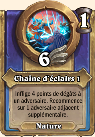 Chaîne d'éclairs Inflige 9 points de dégâts à un adversaire. Recommence sur 1 adversaire adjacent supplémentaire Inflige 14 points de dégâts à un adversaire. Recommence sur 1 adversaire adjacent supplémentaire Inflige 15 points de dégâts à un adversaire. Recommence sur 1 adversaire adjacent supplémentaire Inflige 16 points de dégâts à un adversaire. Recommence sur 1 adversaire adjacent supplémentaire |