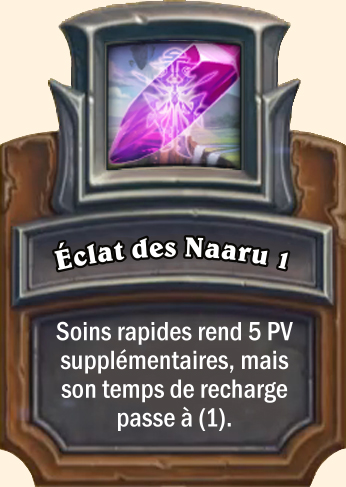 Éclat des Naaru Soins rapides rend 10 PV supplémentaires mais son temps de recharge passe à (1) Soins rapides rend 15 PV supplémentaires mais son temps de recharge passe à (1) Soins rapides rend 20 PV supplémentaires mais son temps de recharge passe à (1) |