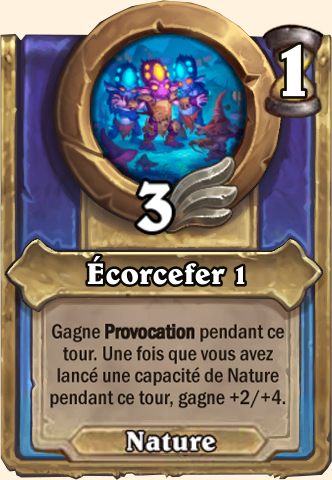 Écorcefer [...] Une fois que vous avez lancé une capacité de Nature pendant ce tour, gagne +3/+6 [...] Une fois que vous avez lancé une capacité de Nature pendant ce tour, gagne +4/+8 [...] Une fois que vous avez lancé une capacité de Nature pendant ce tour, gagne +4/+10 [...] Une fois que vous avez lancé une capacité de Nature pendant ce tour, gagne +4/+12 |