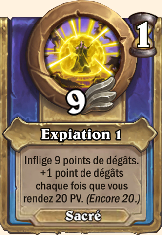 Expiation Inflige 13 points de dégâts. +1 point de dégâts chaque fois que votre groupe rend 20 PV. (Encore 20.) Inflige 13 points de dégâts. +2 points de dégâts chaque fois que votre groupe rend 20 PV. (Encore 20.) Inflige 15 points de dégâts. +2 points de dégâts chaque fois que votre groupe rend 20 PV. (Encore 20.) Inflige 15 points de dégâts. +3 points de dégâts chaque fois que votre groupe rend 20 PV. (Encore 20.) |