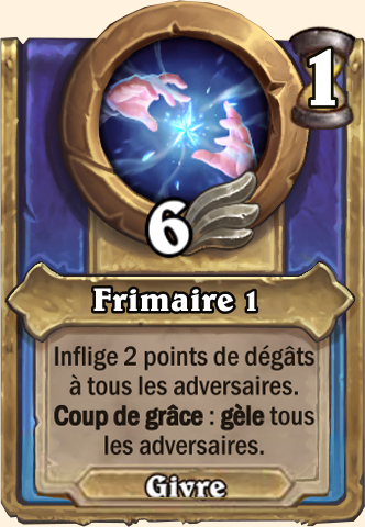 Frimaire Inflige 4 points de dégâts à tous les adversaires. Coup de grâce : gèle tous les adversaires Inflige 6 points de dégâts à tous les adversaires. Coup de grâce : gèle tous les adversaires nflige 7 points de dégâts à tous les adversaires. Coup de grâce : gèle tous les adversaires Inflige 8 points de dégâts à tous les adversaires. Coup de grâce : gèle tous les adversaires |